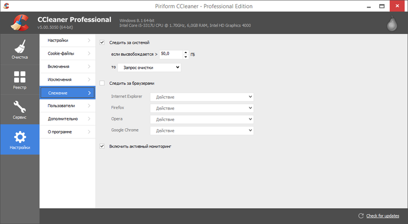 С настройкой Real-Time Monitoring программа автоматически отслеживает папки, временные файл и браузеры. Когда наступает "критический" объем, CCleaner может автоматически или с запросом произвести очистку системы.