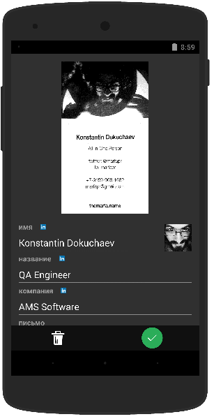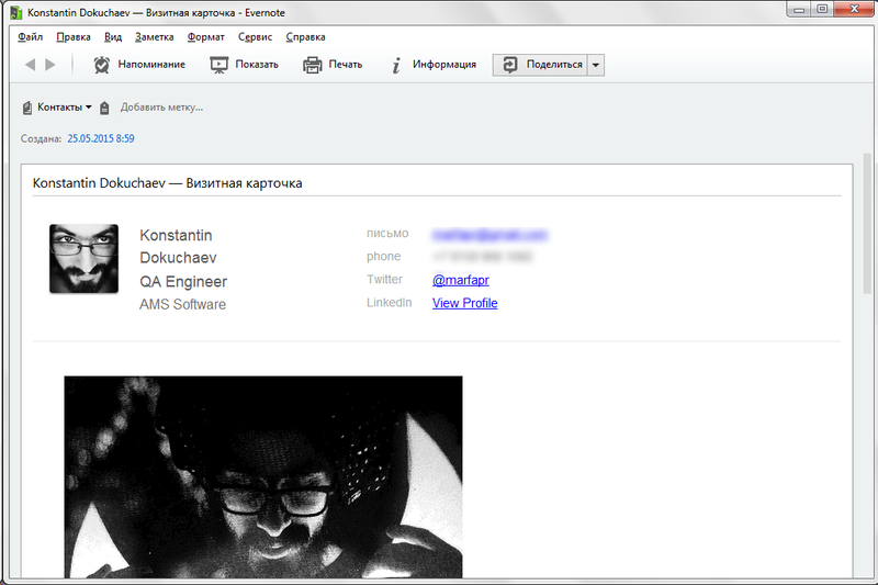 Это достаточно удобная функция. При съемке в специальном режиме Evernote пытается автоматически распознать контактные данные с визитки и постараться найти этого человека в LinkedIn.