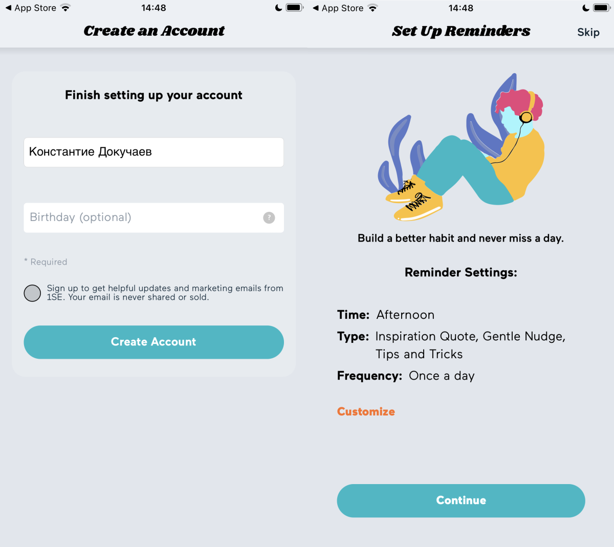 При первом запуске 1 Second Everyday: Video Diary вас попросят пройти регистрацию и активировать триал платной подписки. К счастью, это всё можно пропустить.