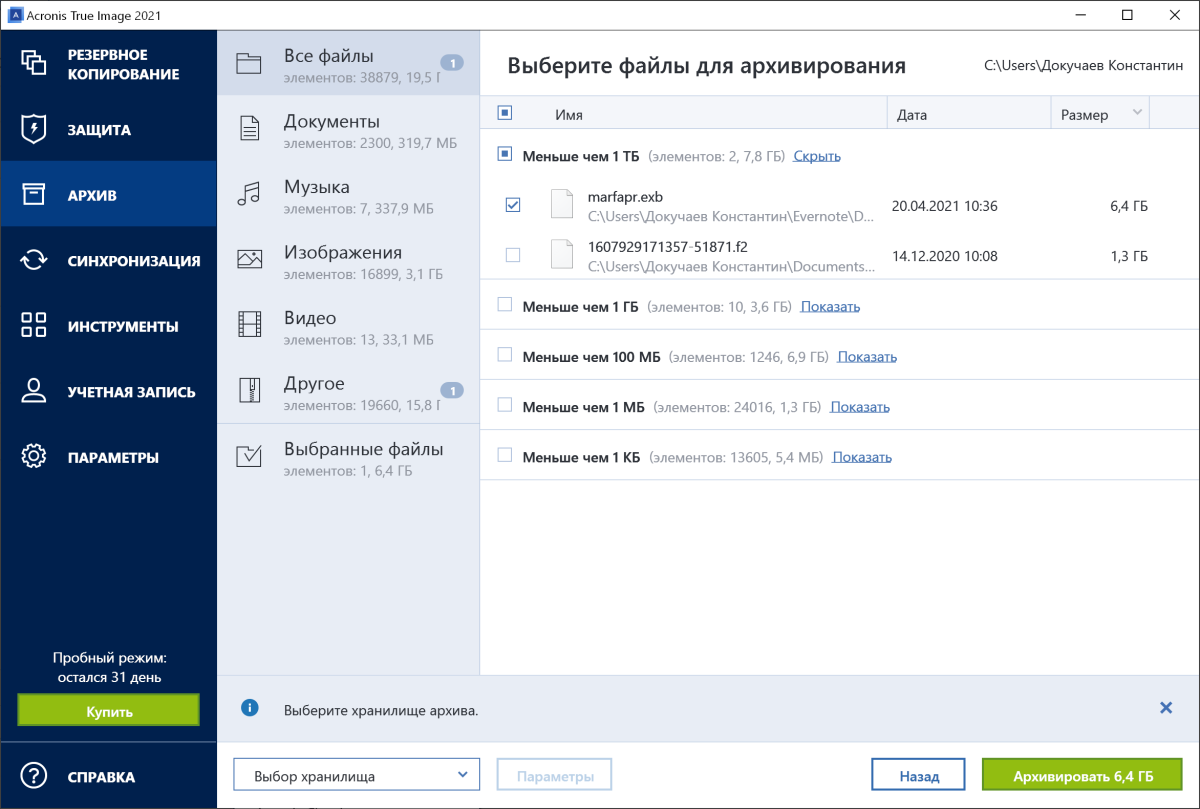 Если вы не знаете, для каких файлов следует делать резервное копирование, этот раздел для вас. Acronis автоматически сканирует папку пользователя и предлагает создать резервную копию файлов в ней. Можно настроить исключения, указать минимальный объём, на который нужно обращать внимание, и многое другое.
