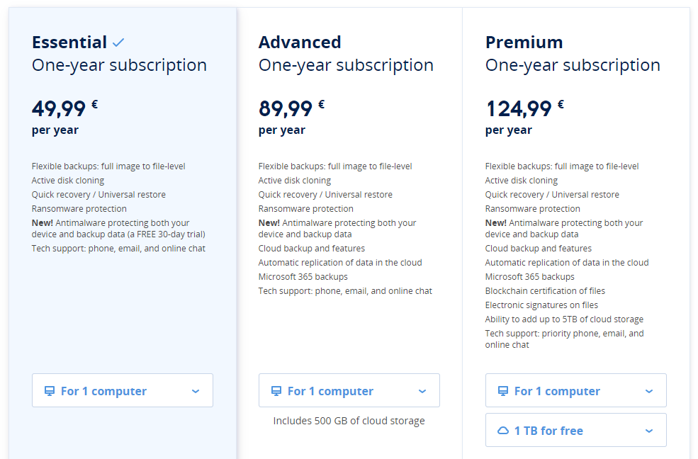 Для ознакомления с Acronis True Image пользователю даётся 30 дней. Платная версия на год начинается от €49,99 за один компьютер.