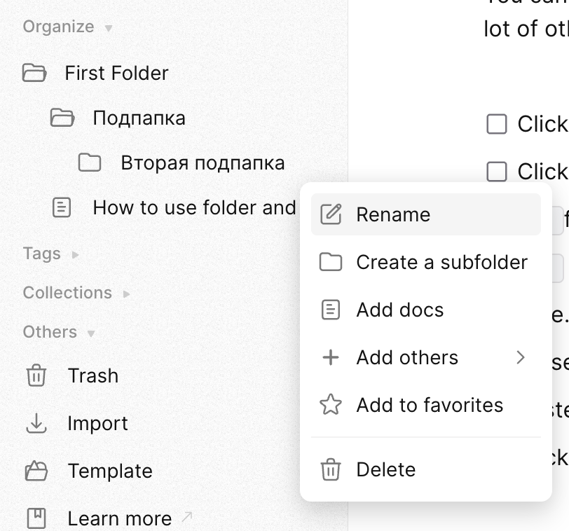 Заметки можно организовывать по папкам с многократной вложенностью. Также поддерживаются теги и коллекции.