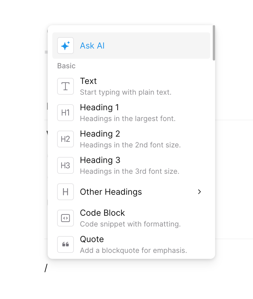 Как и в Notion-лайках, с помощью / вызывается меню быстрых команд, из которого можно применять форматирование к тексту. Есть заголовки, блоки кода, цитаты, разделители и всё, к чему вы привыкли в аналогах.