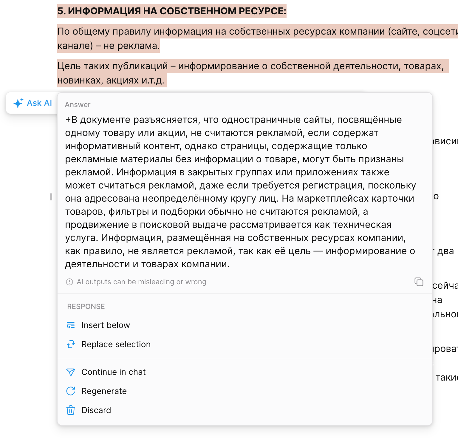 Ответ можно вставить под выбранным текстом, заменить им текущий текст или перейти в полноценный чат с нейросетью.