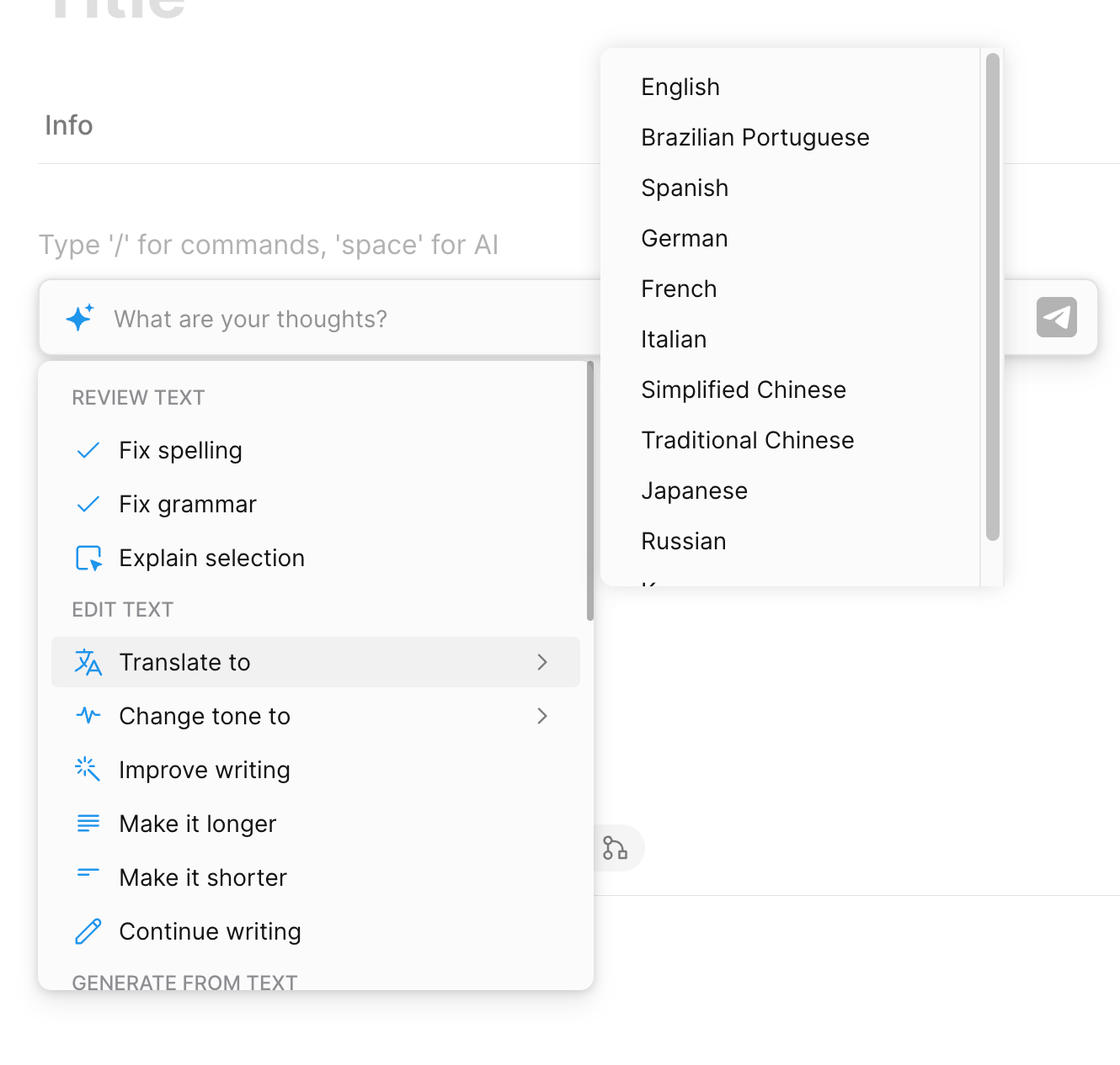 Второй вариант — вызвать диалог с ИИ в пустой заметке. В целом список команд ничем не отличается от уже готовой заметки, но на первый план выведен диалог с ИИ. Таким образом, можно попытаться провести мозговой штурм или создать рыбу будущей заметки.