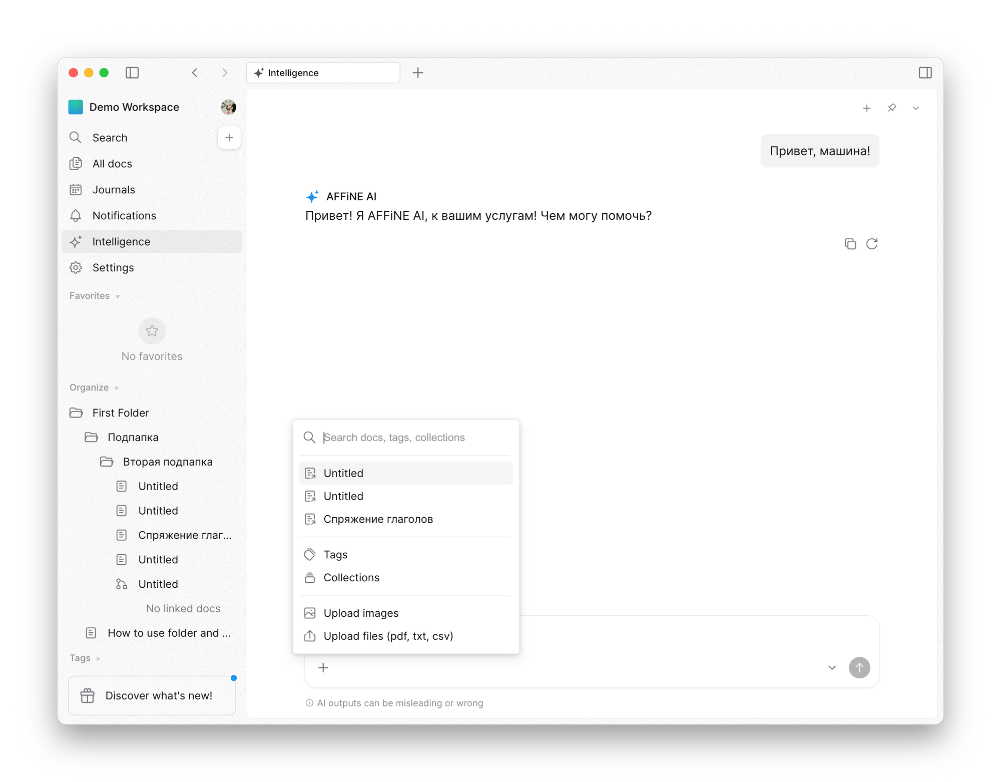 Последний вариант — полноценный чат с ИИ. Если вы работали с ChatGPT, то и здесь всё будет привычно. Из уникальных штук стоит выделить возможность добавлять к беседе данные из заметочника, включая теги и целые коллекции.