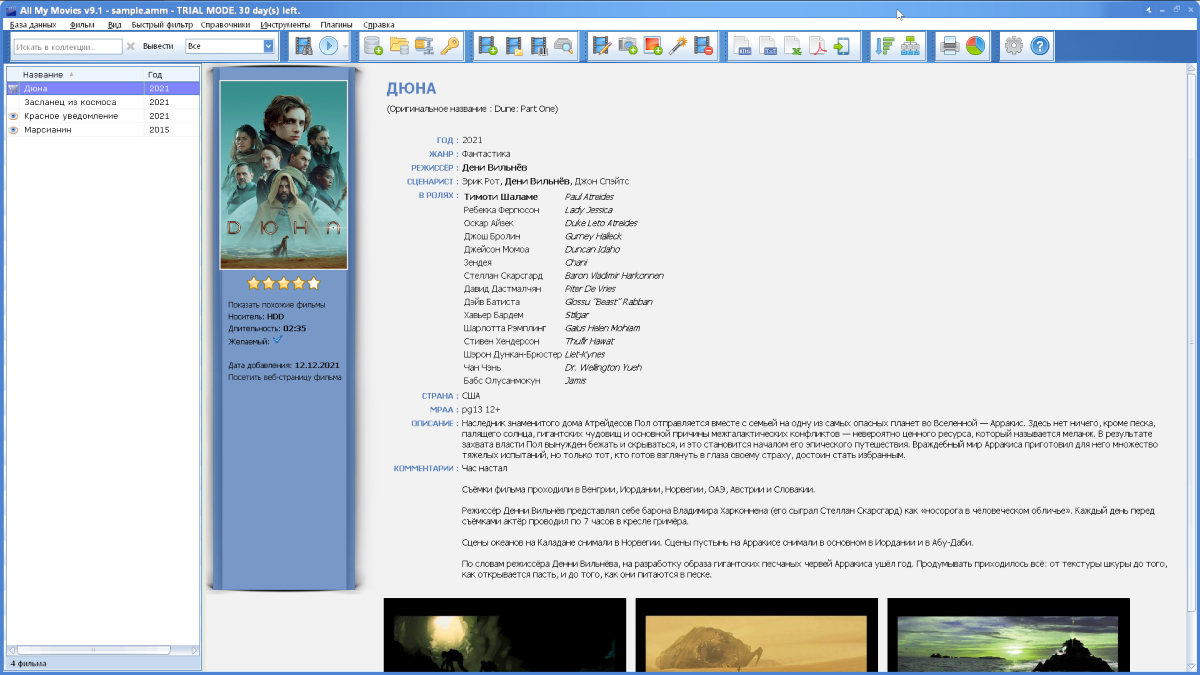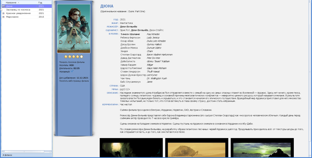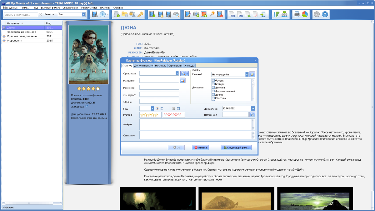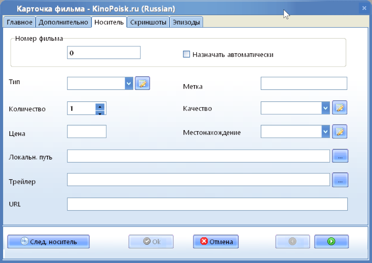 Как я писал выше, информацию можно добавлять вручную или с помощью Кинопоиска. В итоге карточка фильма может содержать самые различные данные о нём.