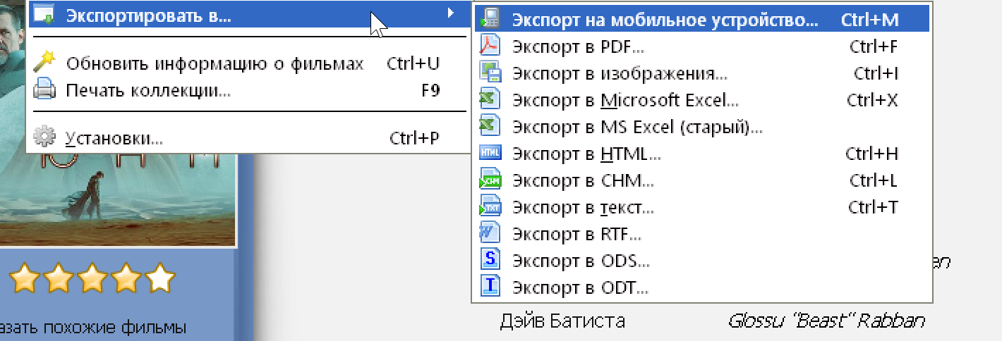 All My Movies использует свой собственный формат баз amm. Но приложение поддерживает экспорт данных в pdf, изображения, MS Excel, html, chm, текст, rtf, ods и odt. А импорт — из текста, excel или amm.