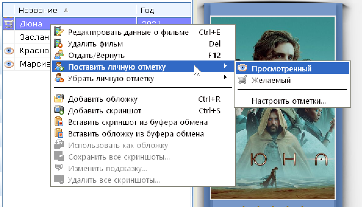 К фильмам можно добавлять метки. По умолчанию это: просмотренный и желаемый. Но можно добавлять свои метки.