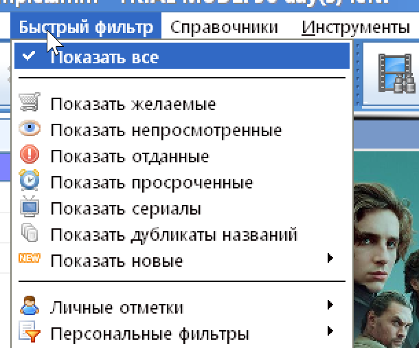 Также фильм можно пометить как отданный, когда кто-то его взял посмотреть, или возвращённый, когда фильм вам вернули. По всем меткам или типам фильмов (сериалы, новинки, дубли) есть возможность фильтрации.