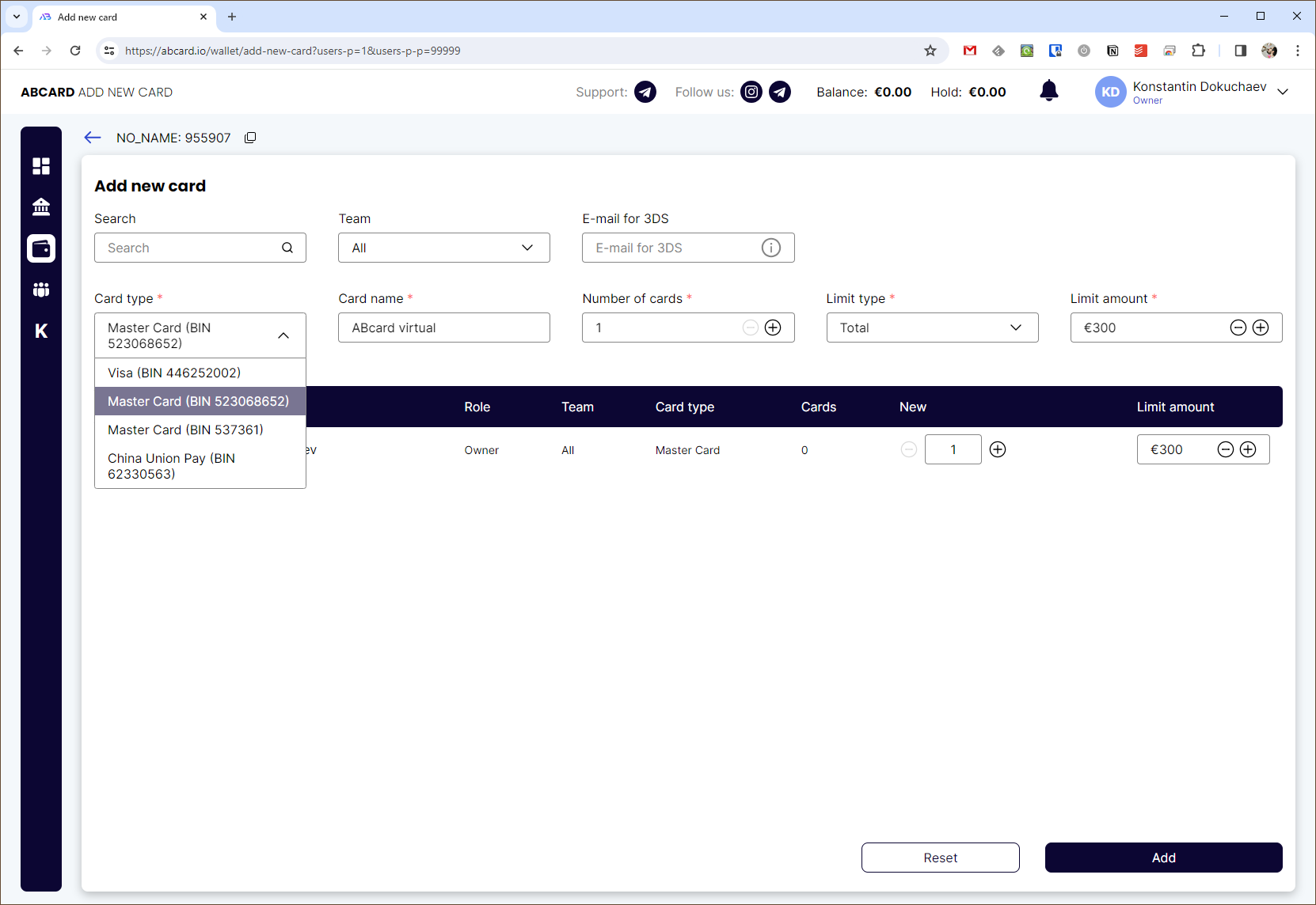 Выпустить карту можно прямо со страницы Дашборда или Кошелька нажатием на кнопку Add Cards. Для этого нужно выбрать тип карты: Visa, MasterCard, UnionPay. Затем задать имя карты, выбрать их количество и установить лимиты (общий, на месяц, неделю или день). Валюта — только евро.