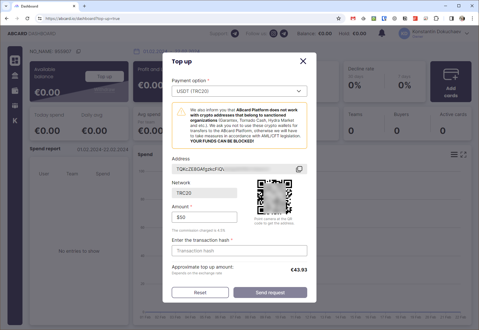Я пополнял баланс криптой. Если вы пойдёте тем же путём, то лучше это делать с горячего или холодного кошелька. Пополнение с бирж тоже возможно, но есть ограничения. В остальном всё как обычно: нужно перевести указанную сумму на адрес кошелька сервиса и в окне пополнения указать хеш транзакции. Минимальная сумма пополнения — $50, из которой будет вычтена комиссия 4,5%.