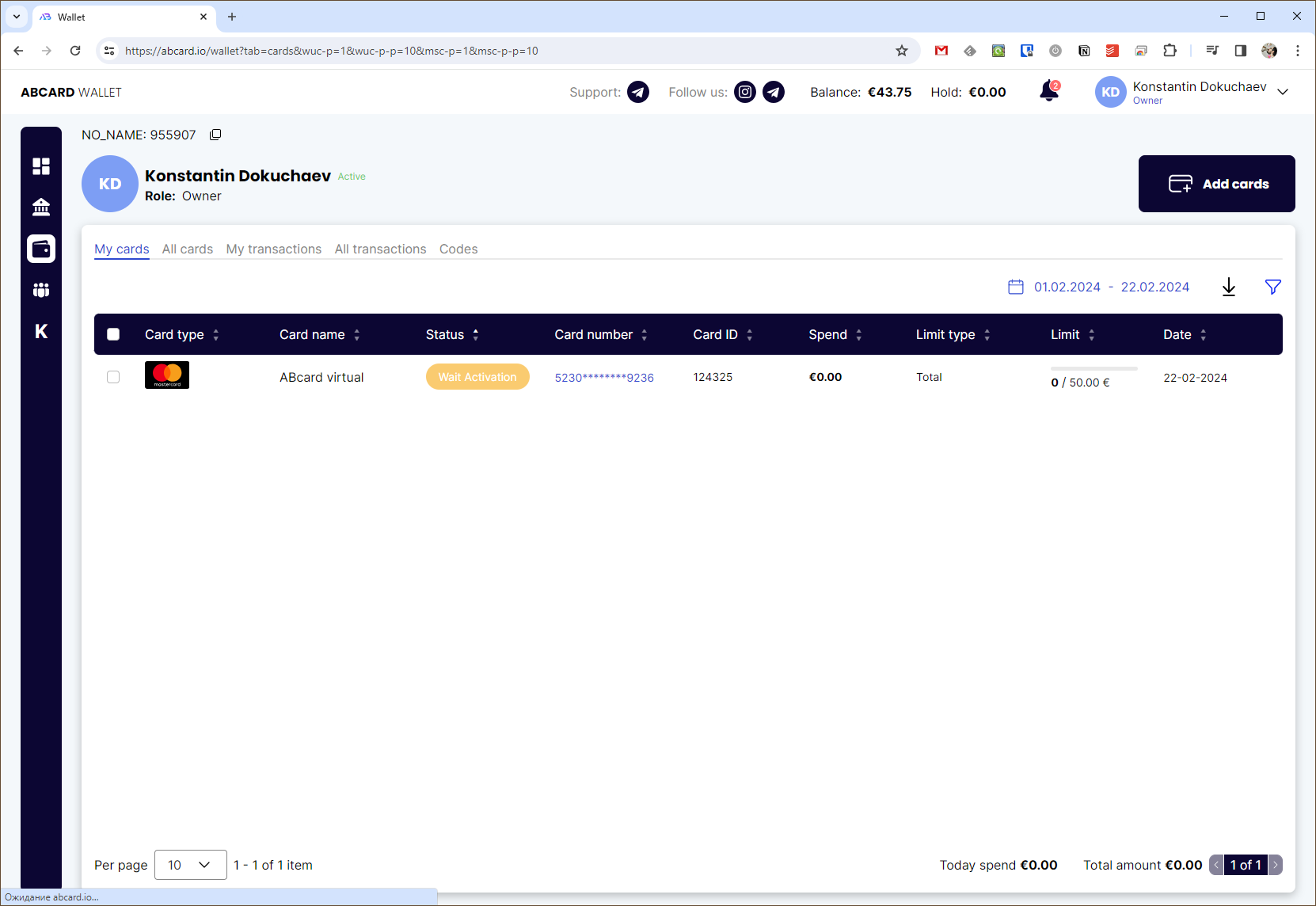 При нажатии кнопки Add и наличии достаточной суммы на балансе вы попадёте на вкладку с отображением всех карт аккаунта и их статусом. Если карта новая, то придётся немного подождать её активации со стороны сервиса. Выпуск карты бесплатный, и все карты поддерживают 3DS.