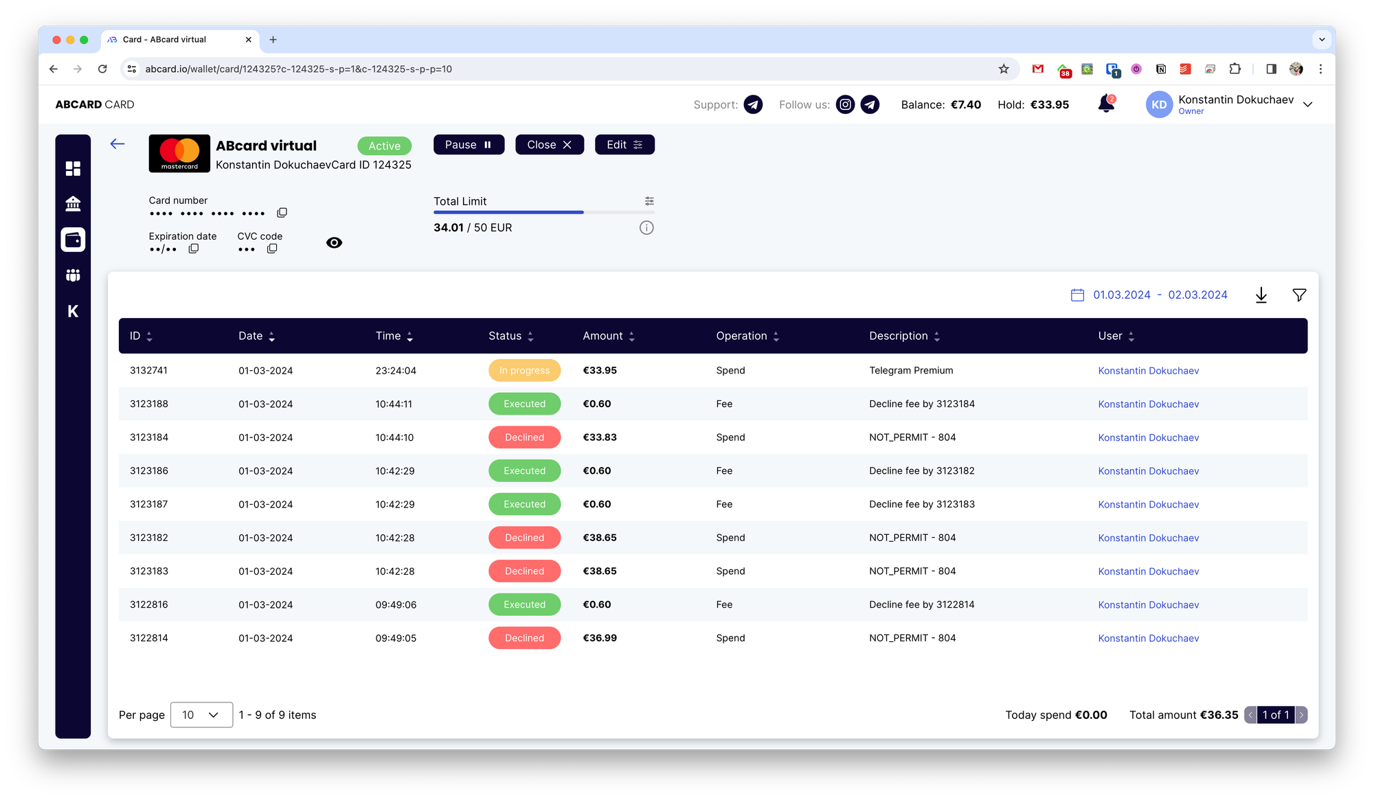 При нажатии на номер карты можно получить её реквизиты, просмотреть список трат, отредактировать данные, поставить на паузу или закрыть карту. В списке трат есть фильтрация по статусу платежа: in progress, executed, declined и прочее.