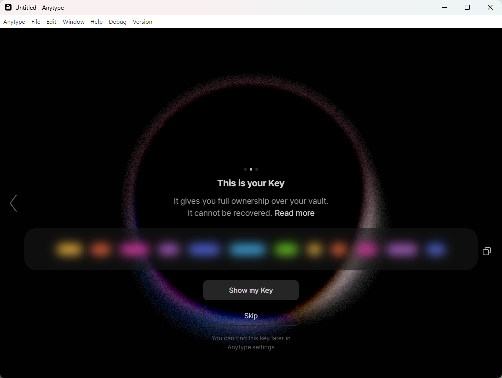 Далее уже предстоит пройти через пару непривычных шагов для подобного рода приложений. В Anytype все данные хранятся локально в зашифрованном виде. Поэтому вам понадобится сгенерировать ключ, который потом ни в коем случае нельзя терять. Иначе вы не сможете получить доступ к данным.