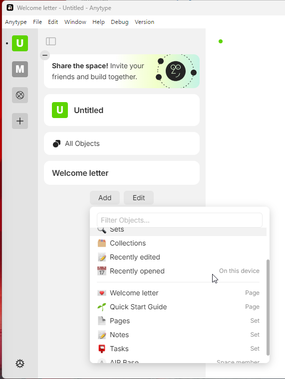 Все данные хранятся в пространствах, а уже внутри пространства можно создавать нужные вам объекты. Объектов не так уж и много, но их достаточно для любых типов данных: коллекции, недавно открытые, страницы разных типов, другие участники пространства.
