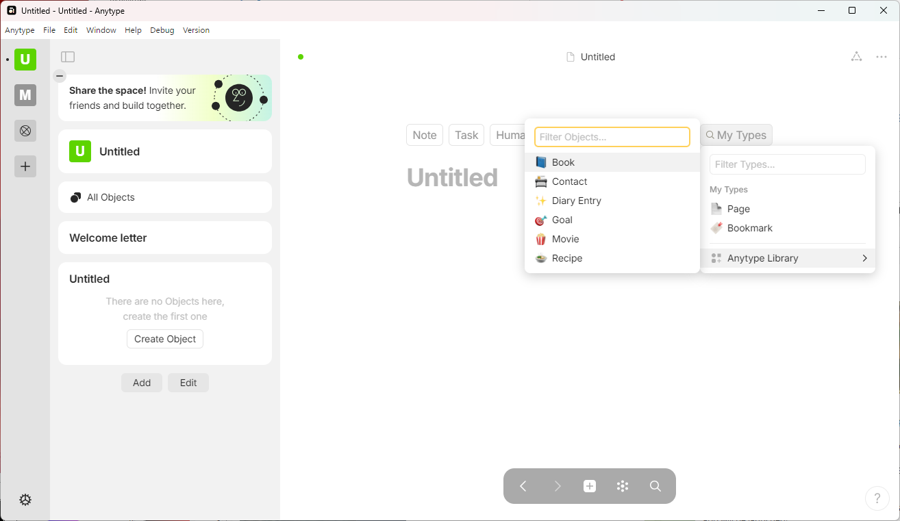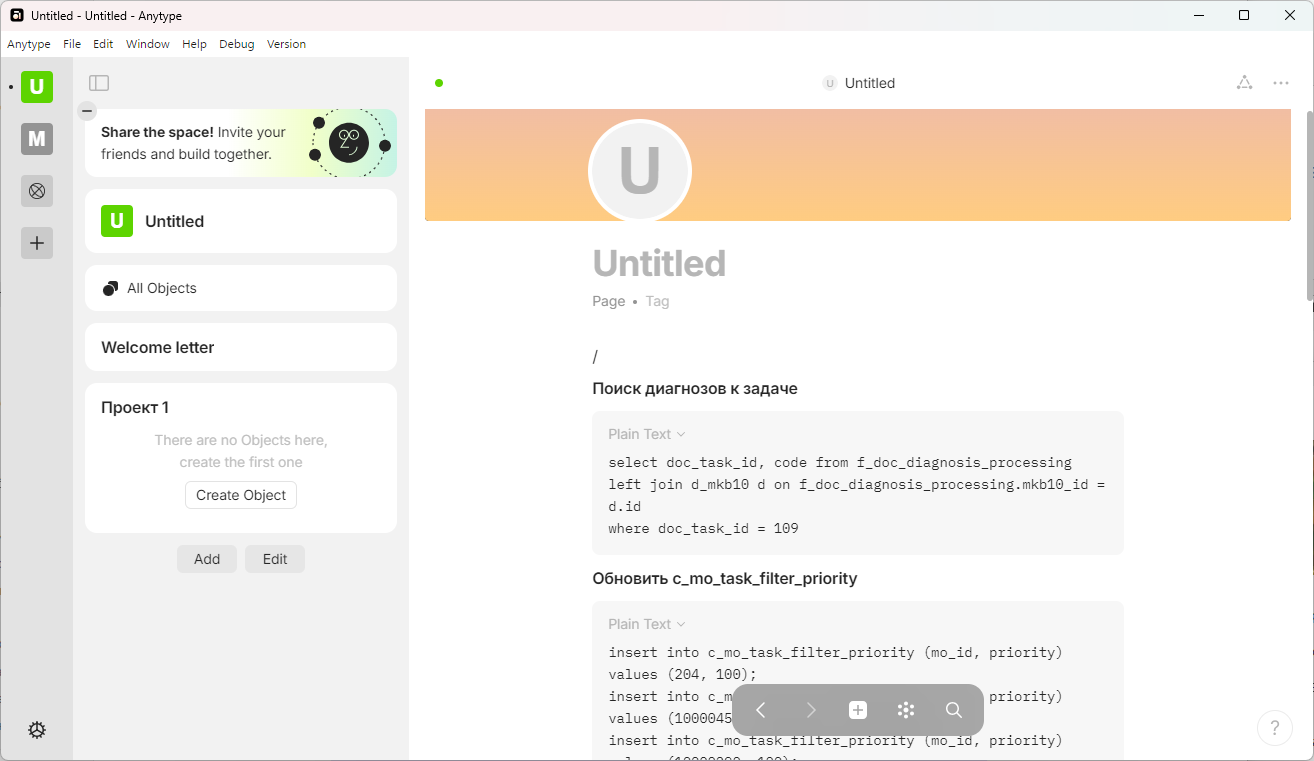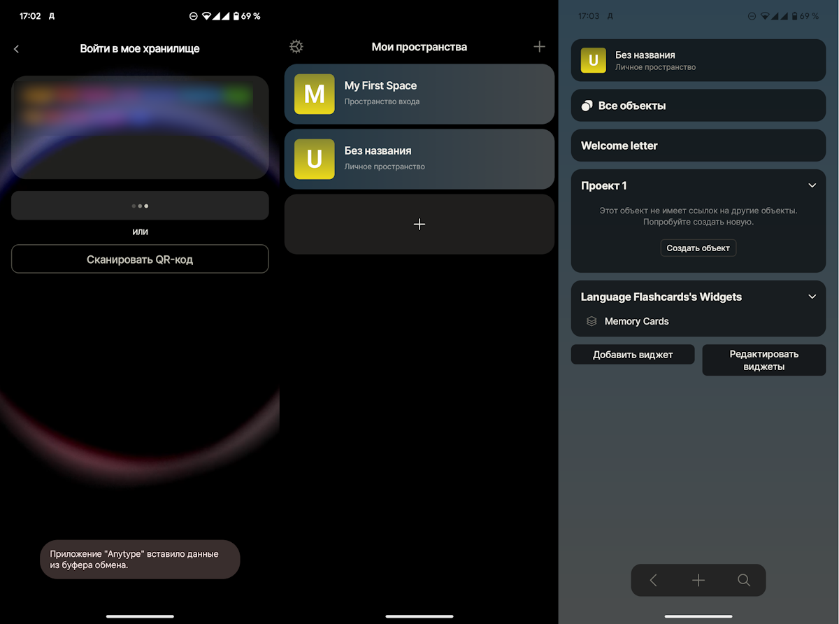 Как ни странно, вариантом, который работает локально и умеет в синхронизацию без серверов, оказался сервис Anytype. Это кроссплатформенный сервис для ведения заметок наподобие Notion, который позволяет хранить данные локально в полностью зашифрованном виде. Но и про синхронизацию ребята не забыли.