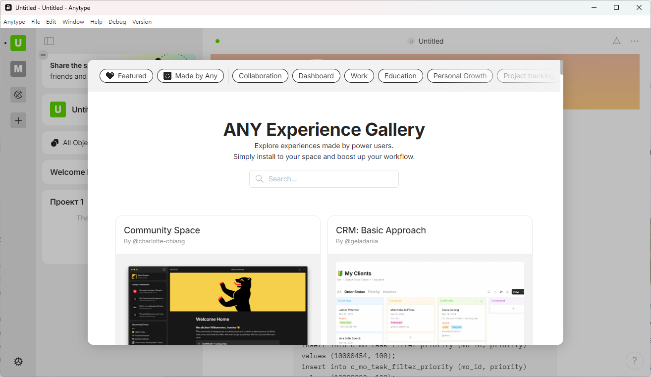 Есть возможность создать пространство по шаблону от других пользователей из сообщества Anytype.