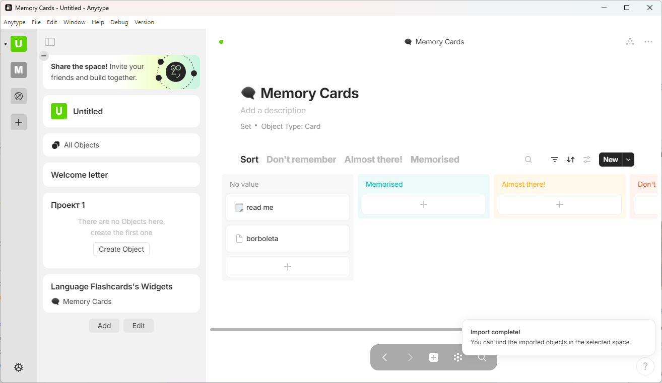 В итоге вы можете создать проект не только с обычными заметками или базой знаний, а например, сделать себе флеш-карты для изучения языка.