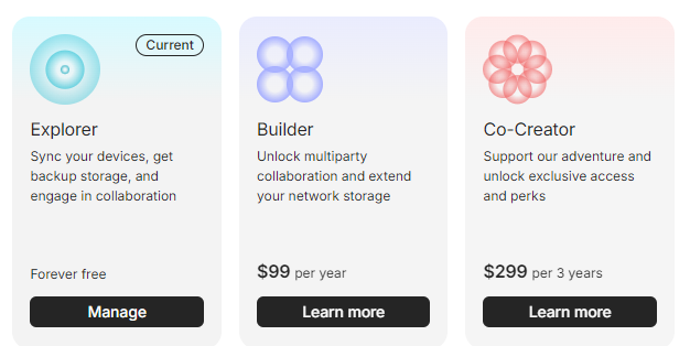 Anytype предоставляет несколько типов подписок, включая бесплатную. В бесплатном варианте вы можете синхронизировать данные (до 1 Гб) между устройствами и работать совместно с другими людьми (три человека в трёх пространствах).