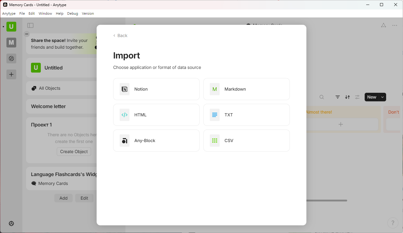 Из крупных сервисов поддерживается импорт только из Notion. Кроме этого, можно импортировать данные из Markdown, HTML, txt и csv-файлов.