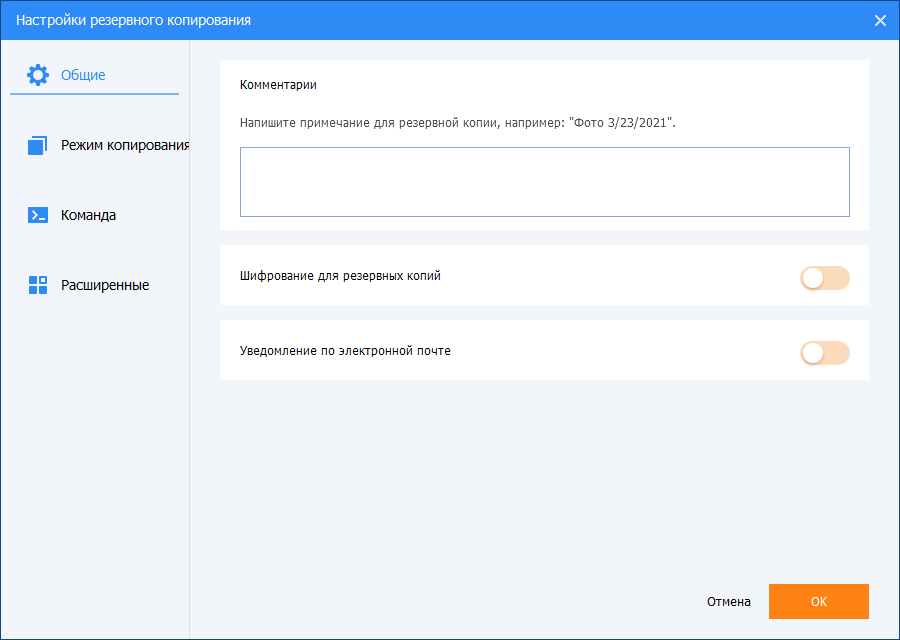 В опциях бэкапа можно указать комментарии, настроить шифрование данных и уведомления на email. Дополнительно можно выбрать режим копирования: интеллектуальное копирование сектора или создание точной резервной копии системы. В чём различие между этими пунктами, AOMEI Backupper заботливо объяснит.