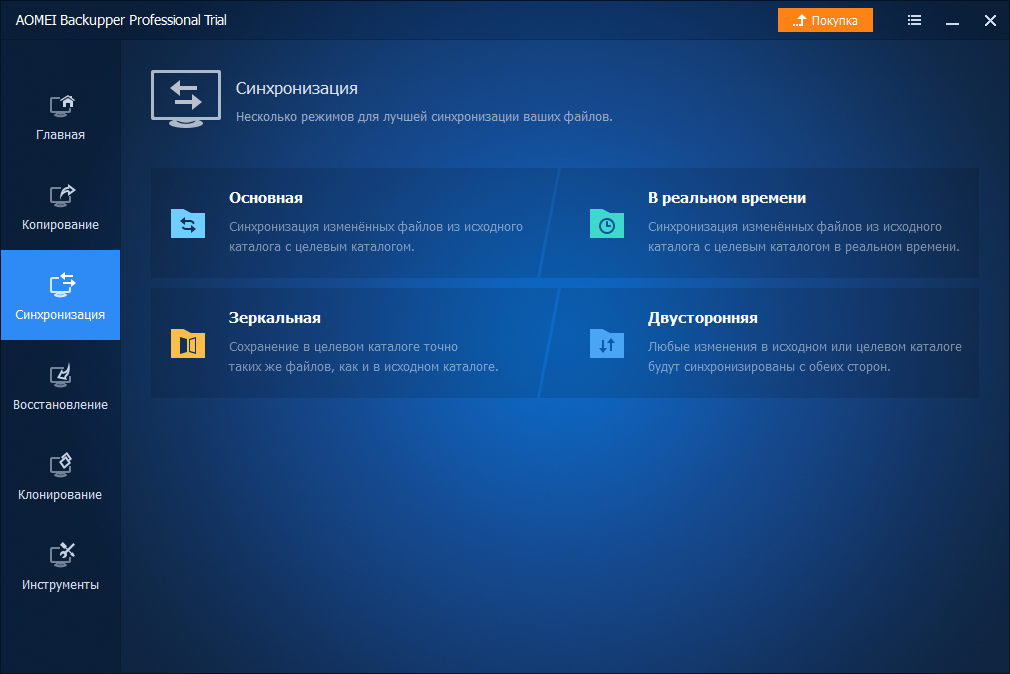 AOMEI Backupper поддерживает четыре вида синхронизации данных: основная (ручная), в реальном времени, зеркальная и двусторонняя.