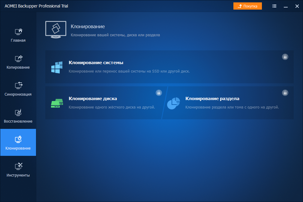 После установки приложения сразу виден ориентир на опытных, но всё же домашних пользователей. Есть шесть основных разделов для каждой возможности AOMEI.