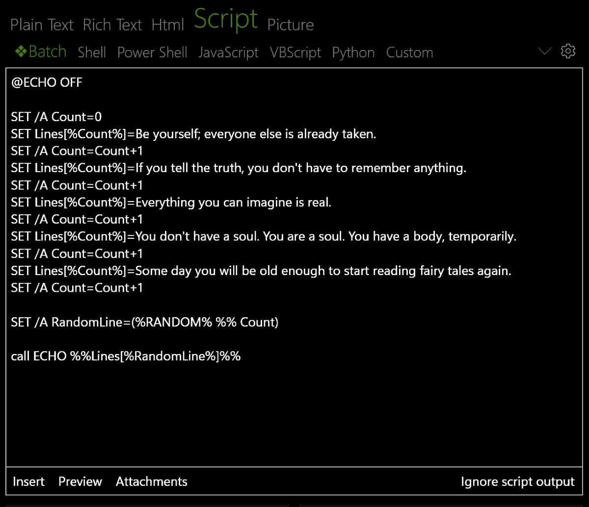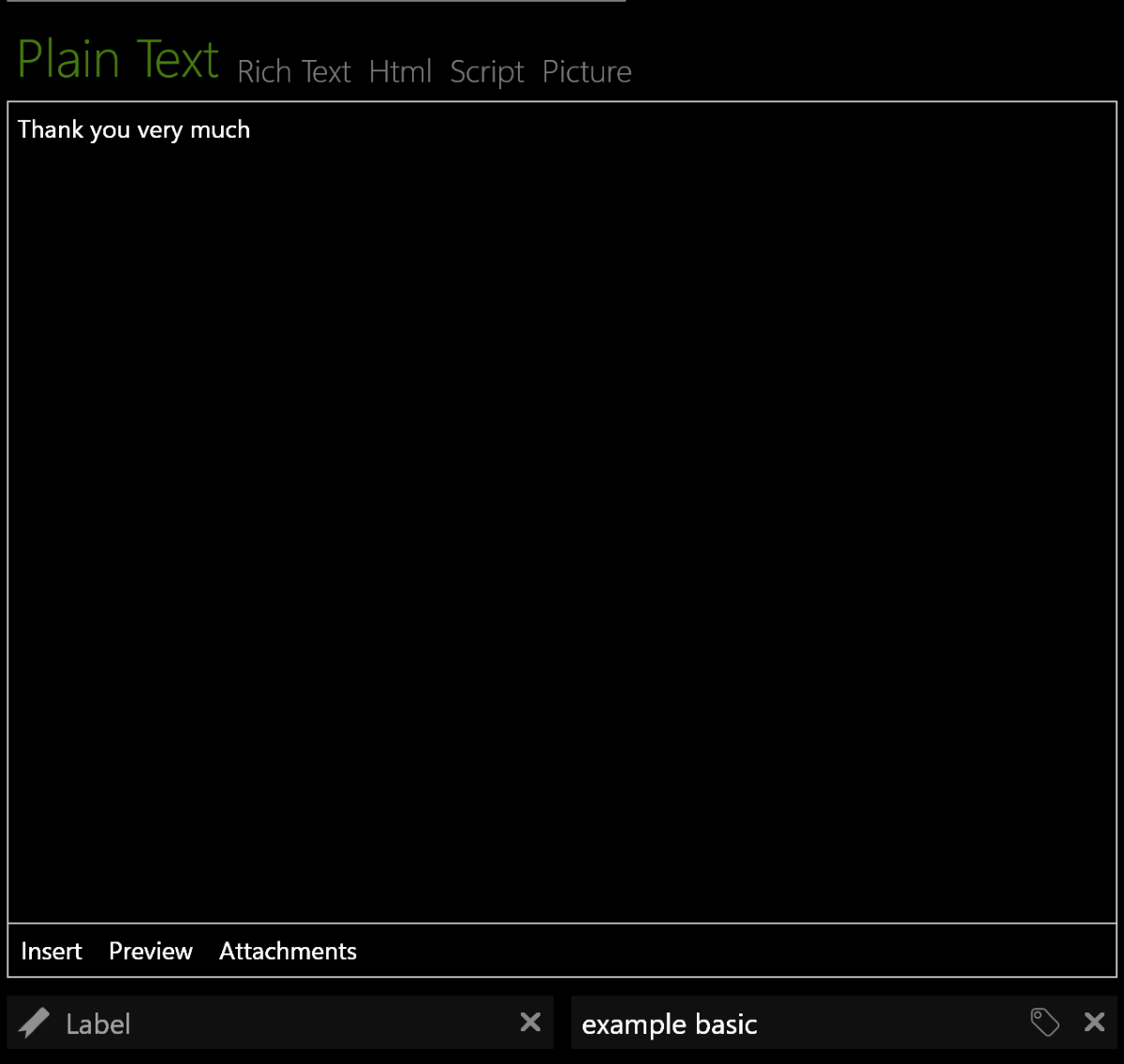 В нижнем блоке, соответственно, нужно указать сам текст, который нужно набрать при выполнении сниппета. Это может быть как обычный текст, так и rich, HTML формат, изображение или даже целый скрипт. При этом можно использовать глобальные переменные, вроде текущей даты и времени.