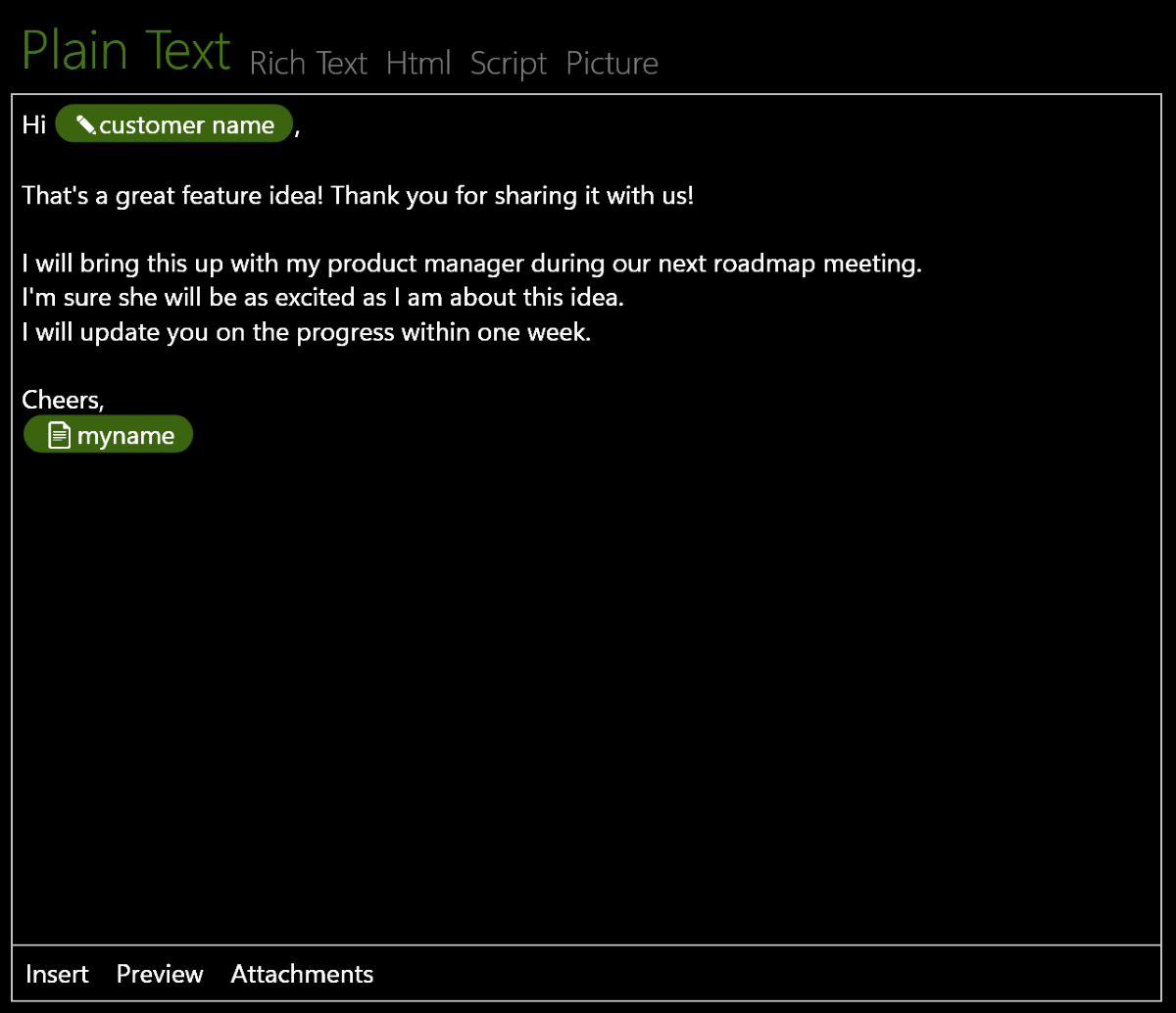 Можно добавлять параметры. Объяснить текстом это непросто, поэтому покажу на видео. По сути, параметры — это слова, которые в автоматически набранном тексте будут заменены на передранные вами.