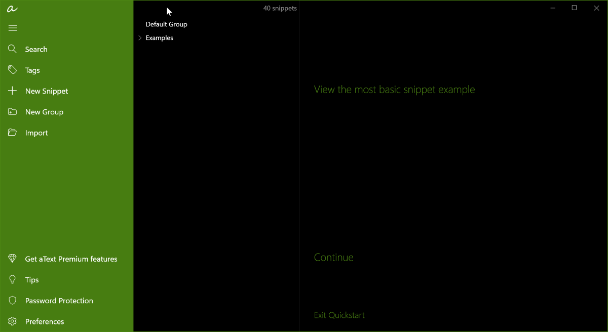 В правой половине окна aText предлагает вам ознакомиться с базовым набором сниппетов. Также можно посмотреть какие-то конкретные примеры, нажав на кнопку Продолжить.