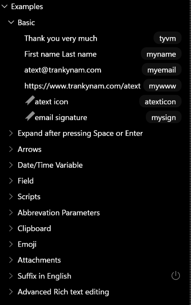 Именно с меню Examples я рекомендую начать знакомство. Здесь вы сможете на конкретных простых примерах понять, как же работают сниппеты и что вообще можно автоматизировать.