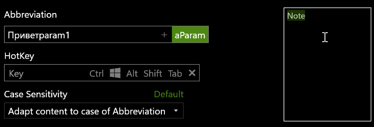 Можно дополнительно указать зависимость от регистра букв или срабатывание при определённой горячей клавише.