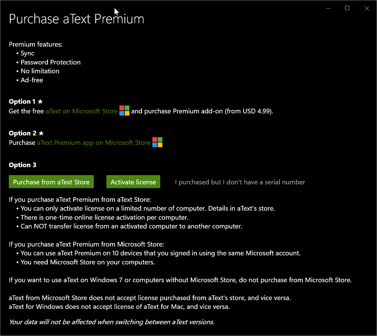Также количество устройств для установки зависит от места покупки лицензии. Если вы скачали aText из Microsoft Store и купили аддон-лицензии за $4.99, то вы можете пользоваться утилитой только на одном устройстве без права переноса лицензии.