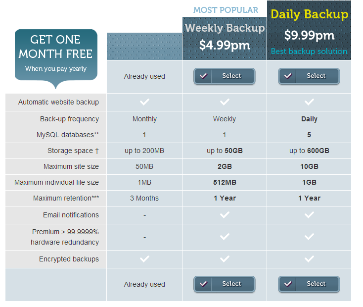 Как видите, создать бесплатно и быстро бекап личного сайта очень легко. Если ваш сайт превышает рамки бесплатного тарифа backupmachine, то всегда можно сменить тариф. Цены, довольно, демократичные.