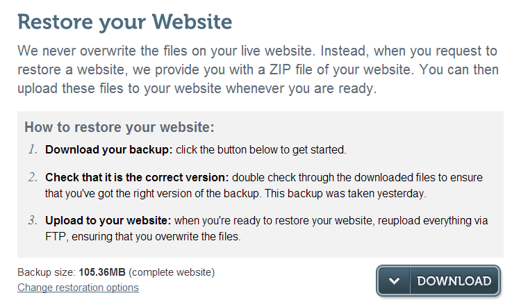 Backupmachine позволяет только ручное восстановление. Для это в разделе Your Website нужно нажать Restore this package. В появившемся окне жмем Download и скачиваем архив с файлами нашего сайта. После чего мы можем вручную залить их на FTP для восстановления.