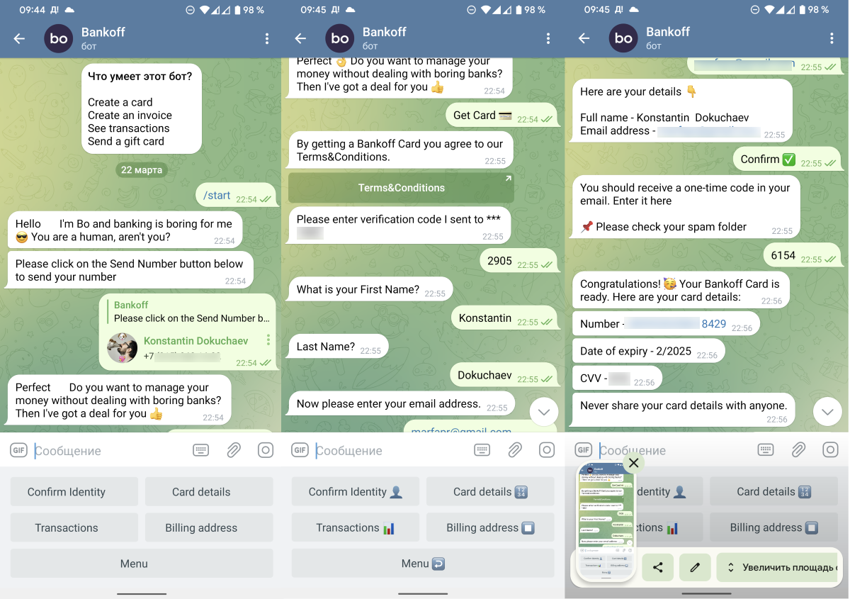 При первом запуске бот запросит номер вашего телефона, чтобы убедиться, что вы не бот. После чего нужно нажать кнопку Get Card, и Bankoff проведёт вас по всем шагам для выпуска карты.