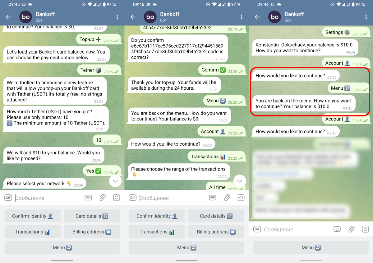 После чего Bankoff пришлёт номер Tether-кошелька для пополнения. После проведения транзакции пришлите боту hash-код транзакции, и спустя какое-то время деньги окажутся на балансе.