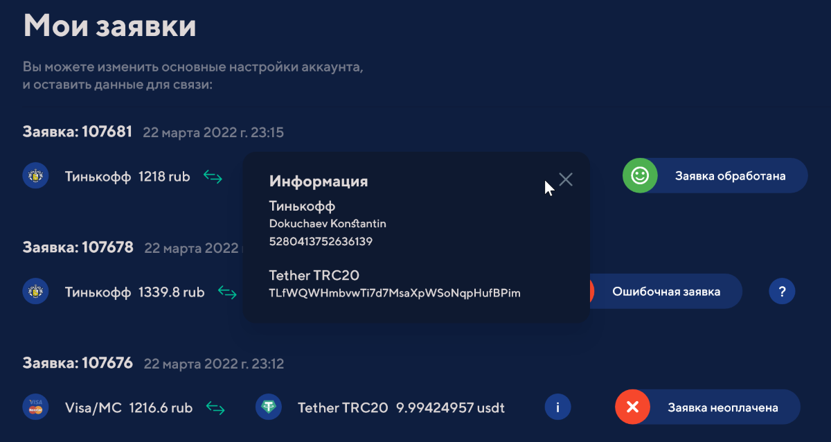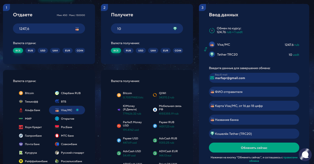 После чего обменник даст номер карты, на которую нужно перевести необходимую сумму в рублях.