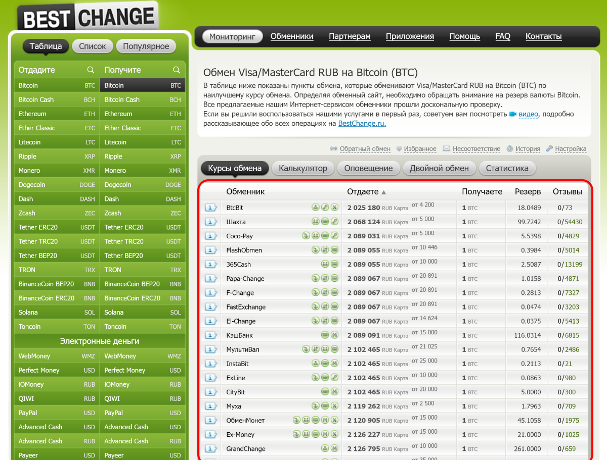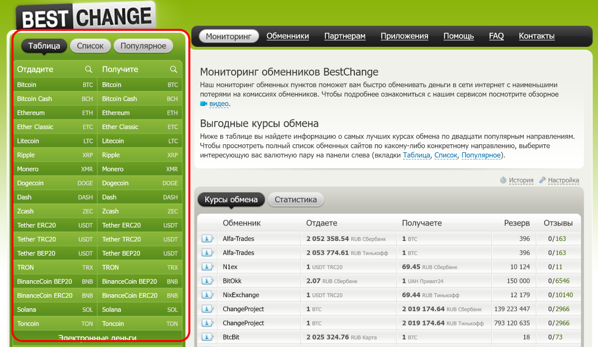На главной странице BestChange в левой части сайта находится список криптовалют, электронных кошельков и фиатных денег, между которыми можно произвести обмен.
