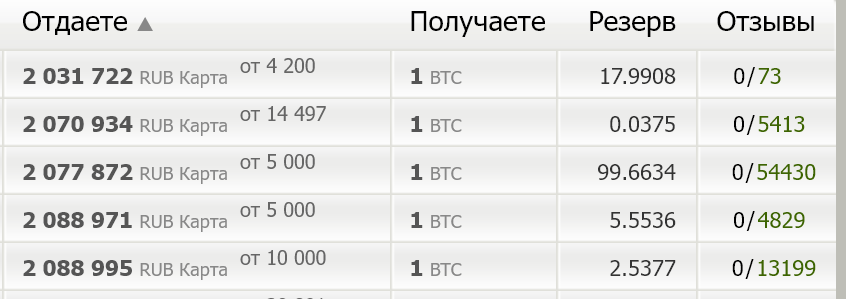 В столбце Резерв отображается максимальная сумма, которую можно купить через данный обменник. А в столбце Отзывы можно увидеть соотношение отрицательных и положительных отзывов, а также почитать их.