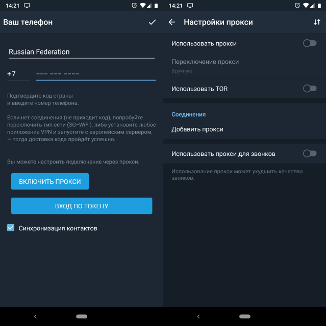 Вы же знаете, что Telegram заблокирован в России? Так вот, зарегистрироваться или войти в мессенджер тоже нельзя. В BGram на этапе авторизации можно включить встроенный SOCKS5, MTProxy или TOR, и авторизоваться без проблем. Эти настройки сохраняются и легко управляются уже из самого мессенджера.