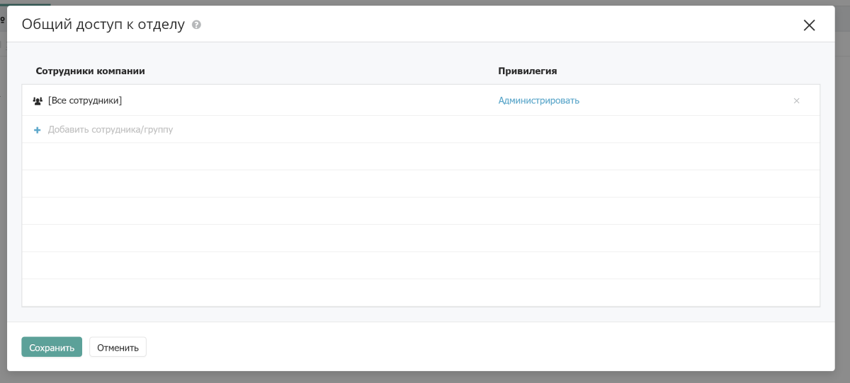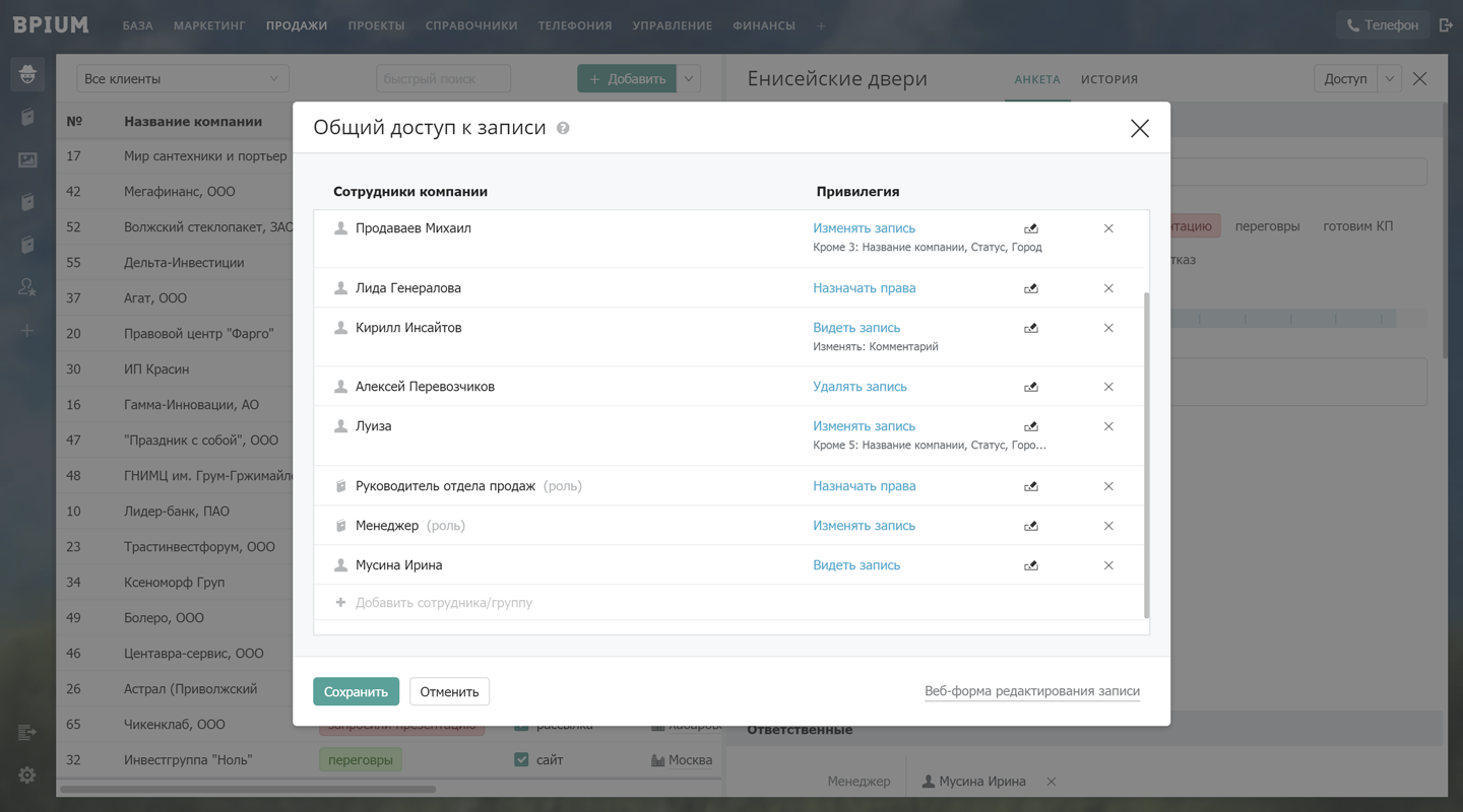 Вы можете ограничить сотрудникам права на создание, изменение, просмотр или удаление любого объекта в системе. Правила можно назначать как на группы (роли), так и на каждого сотрудника в отдельности.