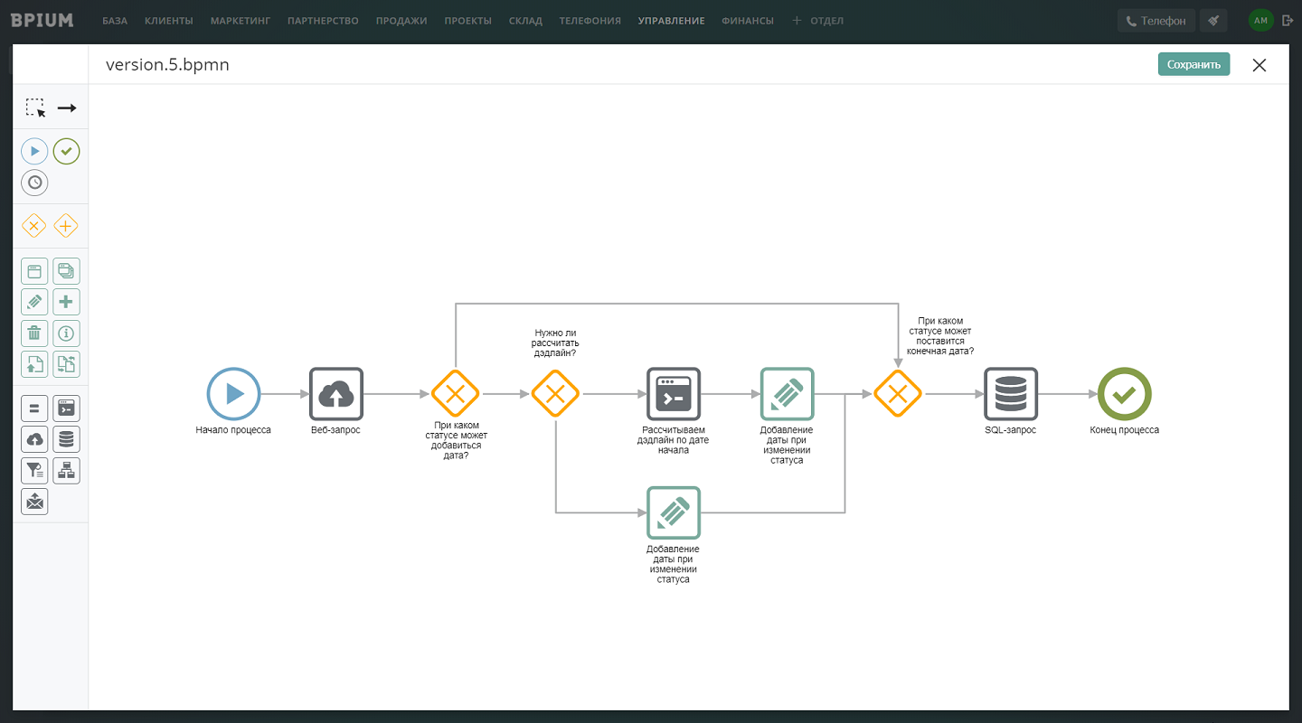 С помощью раздела управления процессами можно не только отслеживать, какие автоматические задачи запущены на текущий момент, но и создавать новые. Бипиум использует нотацию BPMN 2.0. Сама настройка происходит в графическом режиме.