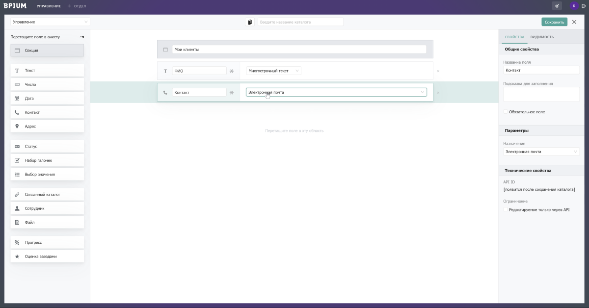 Первым делом нажмите кнопку «Добавить», чтобы начать создание своей будущей CRM. Хотя бы просто потренироваться, понять что к чему. Откроется мастер создания секций (разделов), который сильно напоминает визуальный редактор сайтов. Вы переносите нужный элемент на рабочее пространство, и задаёте ему свойства, названия, видимость и прочие необходимые атрибуты.