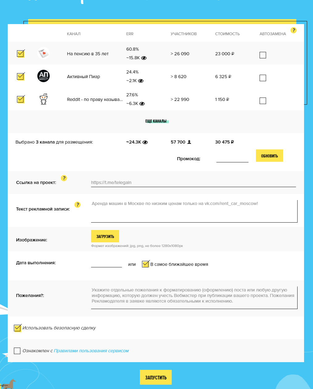 Также есть возможность использовать безопасную сделку. Этот чек-бокс не снимается, вероятно, потому что все сделки безопасные. Оплата будет списана только после подтверждения вами корректного размещения рекламы. До этого момента сумма будет зарезервирована на бирже.