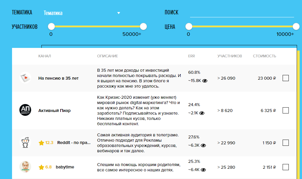 Для подбора подходящих площадок есть удобный фильтр по тематике, количеству подписчиков и цене за пост.