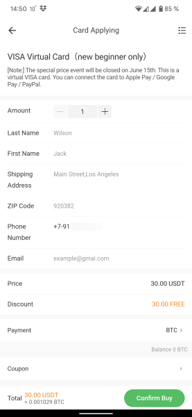 Выпуск карты стоит денег. На момент написания этого поста самая дешёвая VISA Virtual Card стоила 30 USDT. Перед покупкой я рекомендую почитать раздел Learn More у карты и ознакомиться со всеми подводными камнями. Также на карте не будет никакого баланса и её можно пополнять в течение всего срока годности.