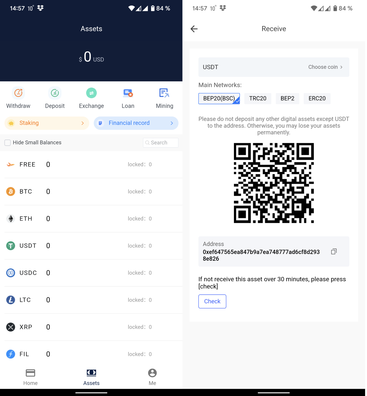 Пополнить свой кошелёк очень просто. В разделе Assetsвыберите нужную криптовалюту, после чего вы получите адрес кошелька и сеть, через которую нужно выполнить перевод.