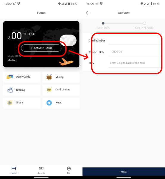 После этого на главной странице нужно нажать кнопку Activate CARD и заполнить полученные данные карты.